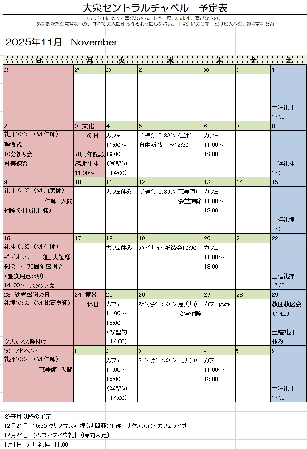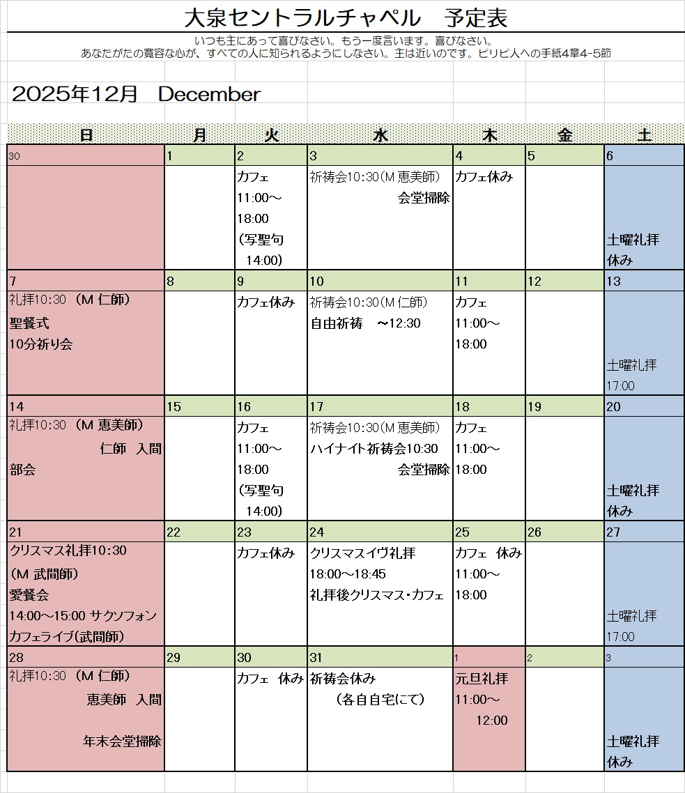 (お休みの日もありますので、予定表でご確認ください。)